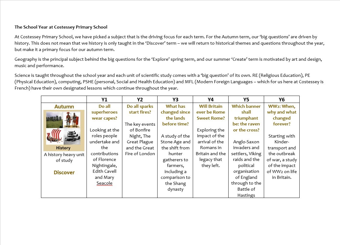 Click on the links to the right to find out more about each subject area and how it is taught at Costessey Primary or read below for an overview of our very own Costessey Curriculum!